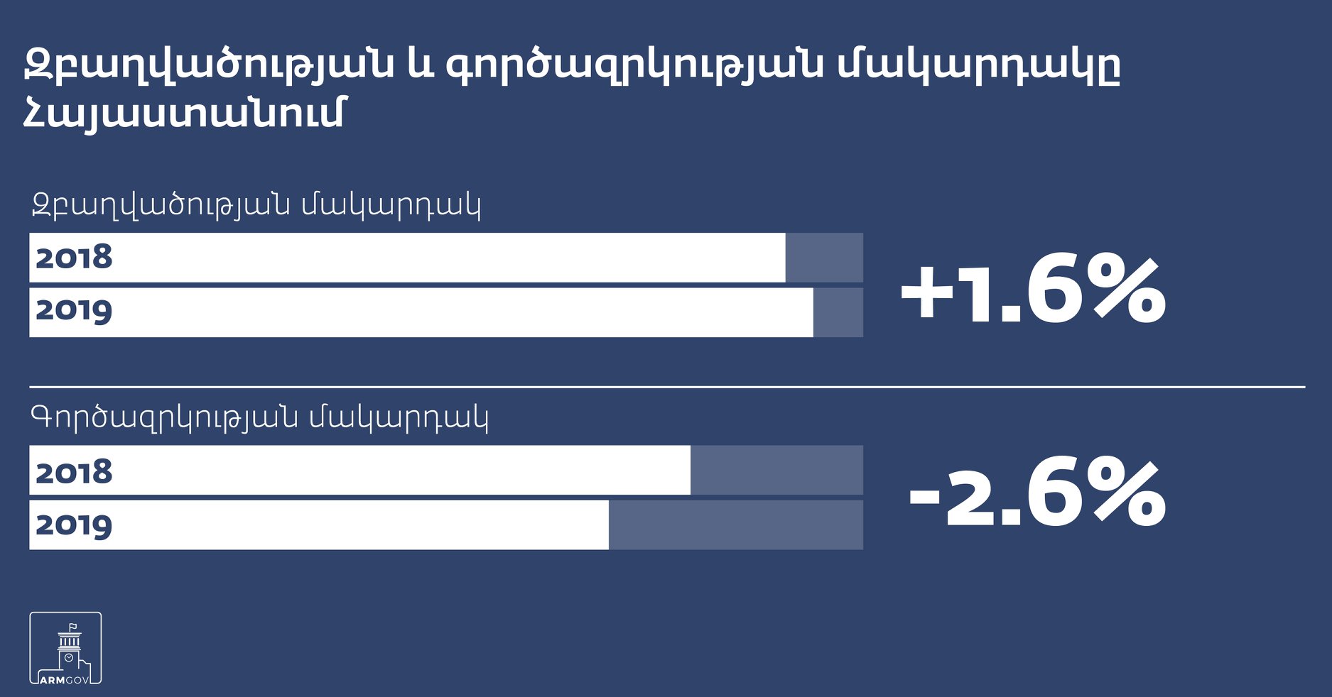 Գործազրկության մակարդակը 2019-ի երկրորդ եռամսյակում նախորդ տարվա նույն ժամանակահատվածի նկատմամբ նվազել է 2.6%-ով ՝ կազմելով 17.7 տոկոս, իսկ զբաղվածության մակարդակը բարձրացել է 1.6%-ով՝ կազմելով 47.9%: