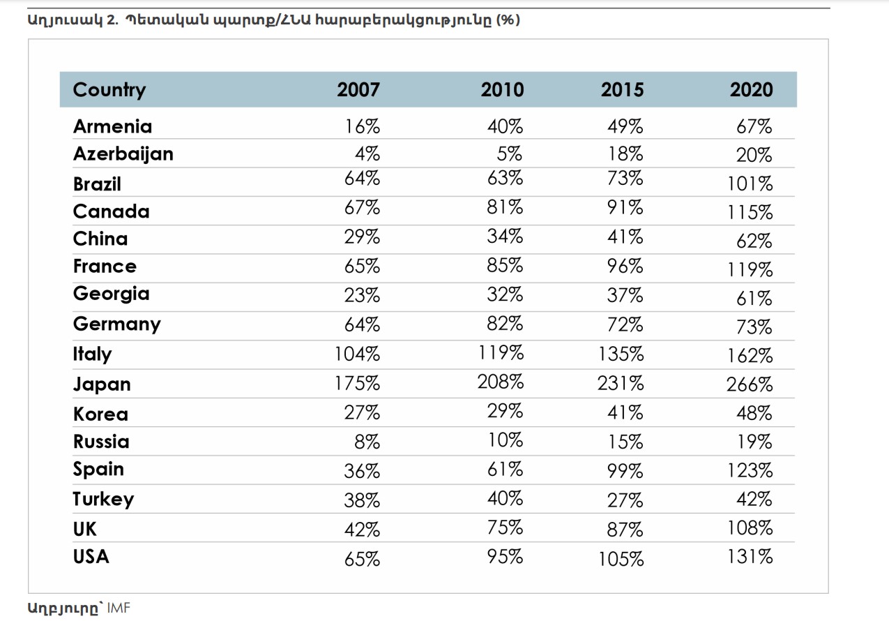 2001 թ. սկզբին ԱՄՆ ընդհանուր ֆեդերալ պետական պարտքը կազմում էր շուրջ 5.7 մլրդ դոլար կամ ԱՄՆ-ի ՀՆԱ-ի 55%-ը։ 2021 թ. սկզբին այդ թիվը հասնում էր շուրջ 28,0 մլրդ դոլարի կամ ԱՄՆ-ի ՀՆԱ-ի 130%-ը։ Հարց է առաջանում, թե ինչքա՞ն պետք է լինի ԱՄՆ-ի պետական պարտքը, որ լինի չափազանց մեծ։ Եվ ինչ կլինի, եթե այն հասնի «չափազանց մեծ պետական պարտք» սահմանագծին։ Աղյուսակ 2-ը ցույց է տալիս մի քանի տնտեսությունների պարտք/ՀՆԱ հարաբերակցությունը։